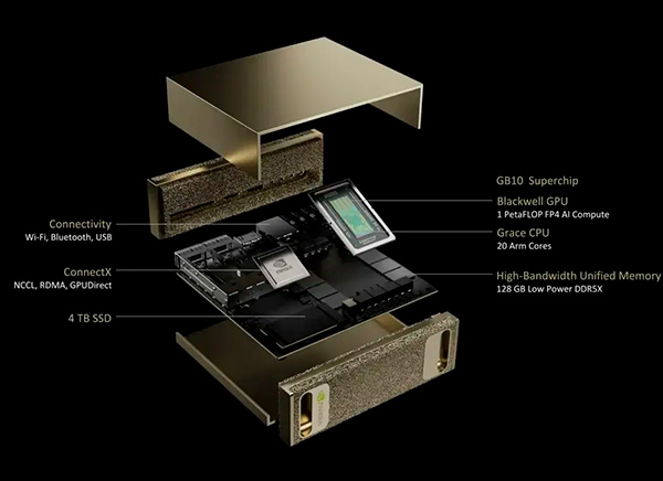 В сердце DGX Spark лежит NVIDIA GB10 Grace Blackwell Superchip — уникальный процессор, объединяющий мощный GPU, построенный на базе архитектуры Blackwell с тензорными ядрами пятого поколения и поддержкой вычислений пониженной точности FP4*, и 20-ядерный Arm-процессор, состоящий из 10 ядер Cortex-X925 и 10 ядер Cortex-A725. Этот чип оптимизирован специально для компактного форм-фактора, но при этом отличается впечатляющей производительностью.