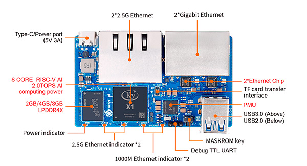 OrangePi R2S на базе 8-ядерного RISC-V AI-процессора Ky X1, обеспечивающего производительность 2 TOPS для выполнения арифметических вычислений общего назначения. Плата имеет 2/4/8 ГБ оперативной памяти LPDDR4X и поддерживает 8 ГБ eMMC.