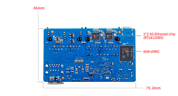 OrangePi R2S оснащен множеством интерфейсов, включая два высокоскоростных порта LAN 2.5G, два порта Gigabit LAN, USB2.0, USB3.0, источник питания Type-C, интерфейс передачи данных на TF-карту, последовательный порт отладки и многое другое. OrangePi R2S — изящный и компактный, размером 79,2*46*1,6 мм, его можно легко установить в различных узких пространствах.