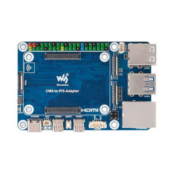 CM5-to-Pi5-Adapter - плата ввода-вывода вычислительного модуля Raspberry Pi 5, представляет собой базовую плату, которую можно использовать с вычислительным модулем Raspberry Pi 5. Благодаря мощным функциям, интегрированным в компактный корпус, он размером всего с кредитную карту. Оснащен двумя портами USB 3.2 Gen1 и двумя портами USB 2.0, что делает его удобным для пользователей.