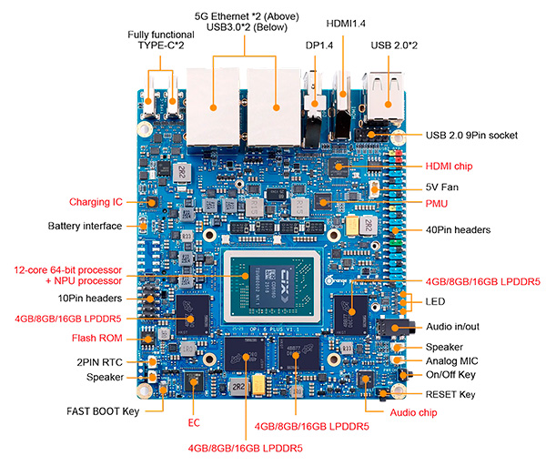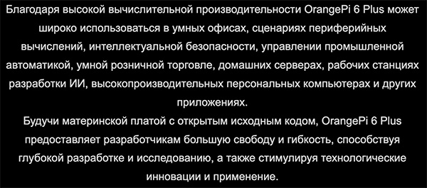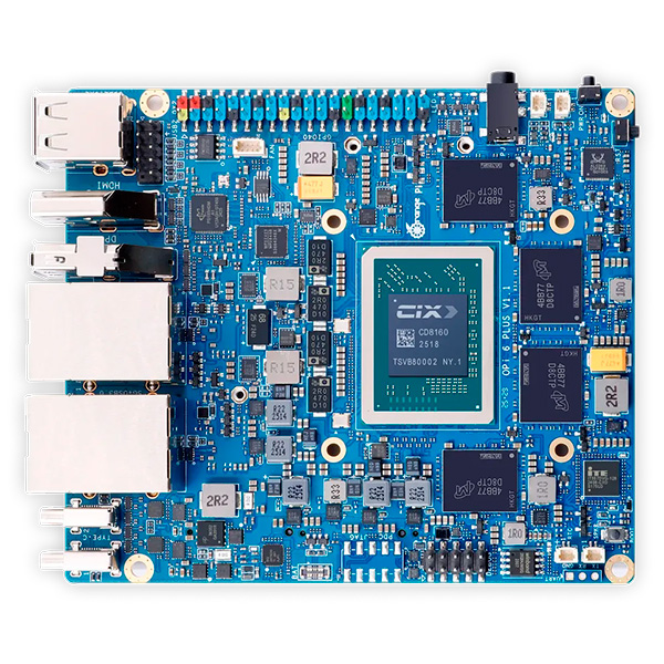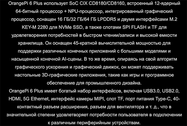 Orange Pi 6 Plus на процессоре Cix CD8180/CD8160 с 12 ядрами в конфигурации 4 × Arm Cortex-A720 с тактовой частотой до 2,8 ГГц, 4 × Arm Cortex-A720 с частотой 2,4 ГГц и 4 × Arm Cortex-A520 с частотой 1,8 ГГц. В состав чипа входят графический ускоритель Arm Immortalis-G720 MC10 и нейропроцессорный блок (NPU). Суммарная заявленная ИИ-производительность достигает 45 TOPS. Микрокомпьютер поставляется в комплекте с активной системой охлаждения (предварительно собрана OrangePi перед отправкой).