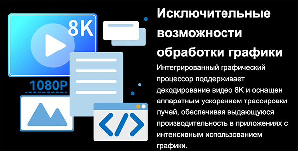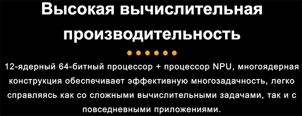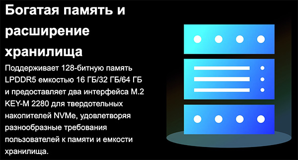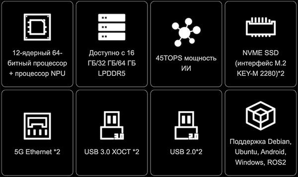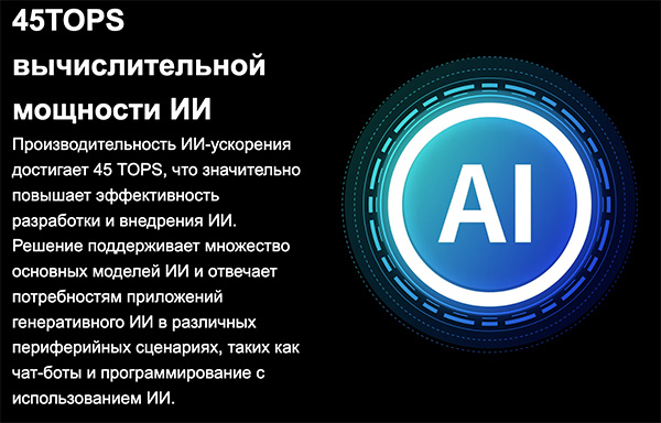 | Процессор: | 12-ядерный 64-битный процессор Cix CD8180/CD8160 (4 × Arm Cortex-A720 с тактовой частотой до 2,8 ГГц, 4 × Arm Cortex-A720 с частотой 2,4 ГГц и 4 × Arm Cortex-A520 с частотой 1,8 ГГц) + нейропроцессорный блок (NPU), вычислительная мощность 45TOPS |
