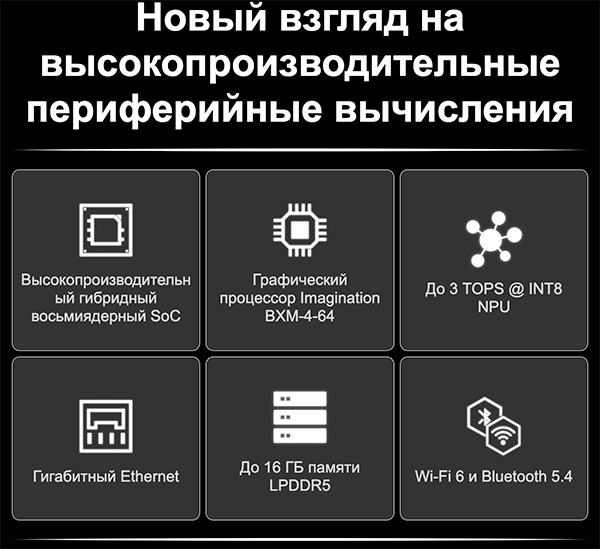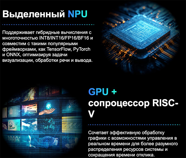 | NPU: | 3 TOPS @ INT8, поддерживает смешанную точность INT8/INT16/FP16/BF16 |