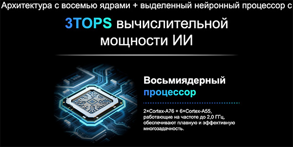 | Процессор: | 2 ядра Cortex-A76 + 6 ядер Cortex-A55, макс. частота 2,0 ГГц |