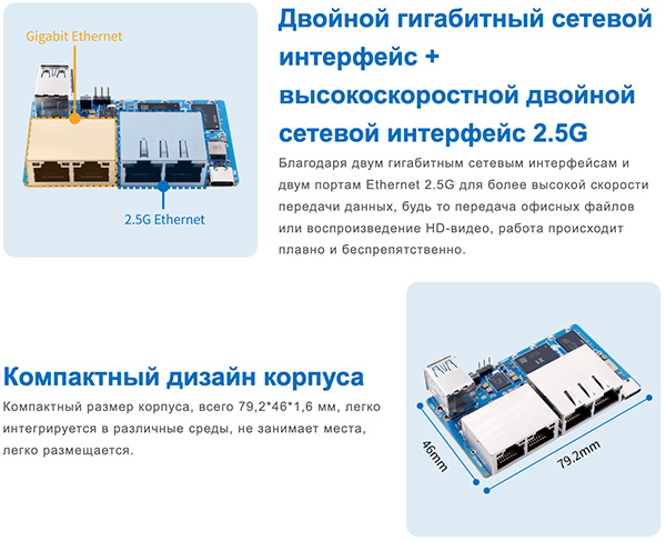 OrangePi R2S оснащен множеством интерфейсов, включая два высокоскоростных порта LAN 2.5G, два порта Gigabit LAN, USB2.0, USB3.0, источник питания Type-C, интерфейс передачи данных на TF-карту, последовательный порт отладки и многое другое. OrangePi R2S — изящный и компактный, размером 79,2*46*1,6 мм, его можно легко установить в различных узких пространствах.